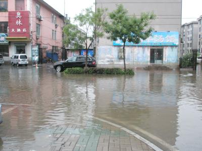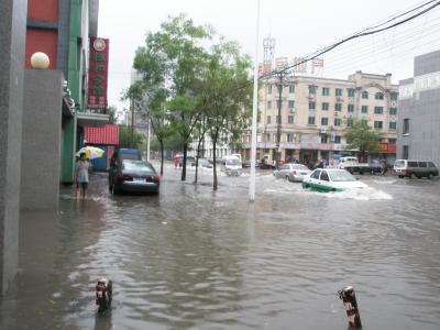 ... regnet es so stark, dass die Straßen in Yingkou überflutet sind.