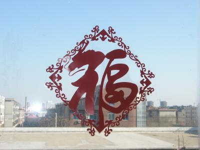 (das Zeichen fú, das Glück bedeutet, Scherenschnitt in unserem Wohnzimmerfenster)