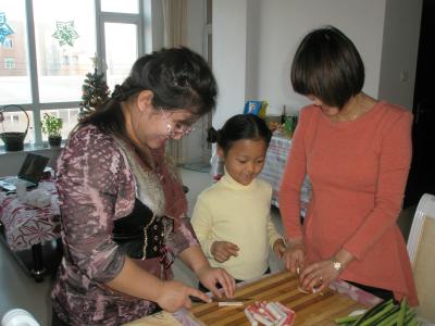 Das schwierigste hatte ich am Freitag alles schon selbst vorbereitet, also das, was am längsten dauert. Samstag sollte noch der Karpfen zubereitet werden (iih, diese blöden Viecher hatten so klare Augen und waren noch voller Blut, die konnte ich nicht selbst machen, Qiwei musste sie erst waschen und dann als der Kopf weg war, konnte ich weitermachen)... Ach ja, und Sushi gab es auch noch und diverses Gemüse für Krautsalat und sonstiges musste auch noch geschnippelt oder gerieben werden.