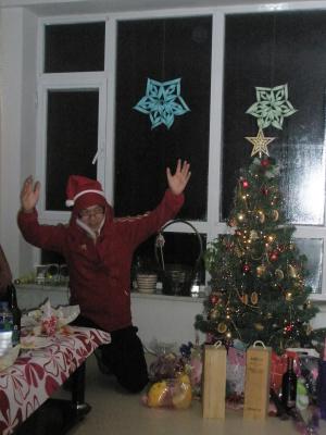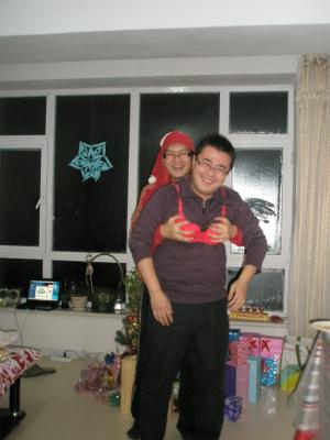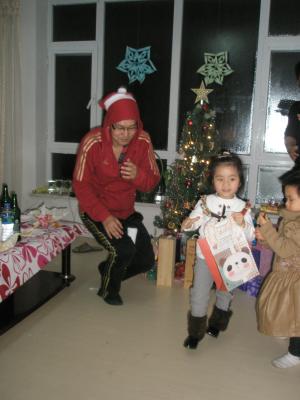 Er machte sich auch ganz gut als Weihnachtsmann und wie es sich für einen richtigen Weihnachtsmann gehört, hatte zumindest die kleine 3-Jährige Angst vor ihm. Als Qiwei Geschenke verteilt hat, wollte sie nie zu ihm gehen. Als ich dann Geschenke verteilte, kam sie sofort zu mir, hat mich zum Dank umarmt und hat nur ängstlich Qiwei im Auge behalten, der neben mir stand. hehe
