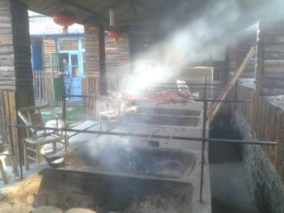 Als alle wieder versammelt waren, sind wir zu einem Bauernhof gefahren, wo man übernachten kann, aber auch zum Beispiel grillen usw. Eigentlich hatten wir anfangs vor auf dem Berg zu grillen, aber da war es viel zu windig. Also haben wir da 2 Zimmer gebucht und haben uns unter einem Dach im Garten breitgemacht, wo dann gegrillt wurde. Man konnte dort auch "Span-Lamm" haben, aber das hätte 4 Stunden gedauert. So lange wollten wir nicht warten und außerdem hatten wir ja unser eigenes Essen dabei. Eines der beiden Zimmer hatte eine Besonderheit: einen Kang 炕. Das ist eine geziegelte Plattform im Raum, in unserem Fall etwa 2x3m groß, die von unten beheizt wird und oben kann man dann drauf liegen, sitzen, oder schlafen. Ist total gemütlich. Nach dem Essen haben wir uns dahin zurückgezogen und haben da dann Karten und Majiang 麻将 gespielt.